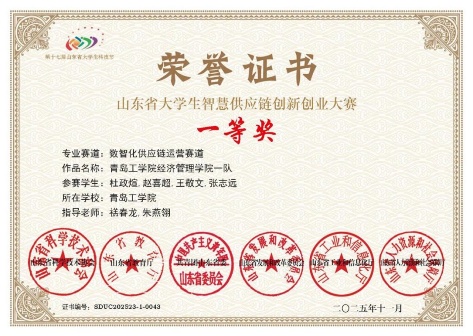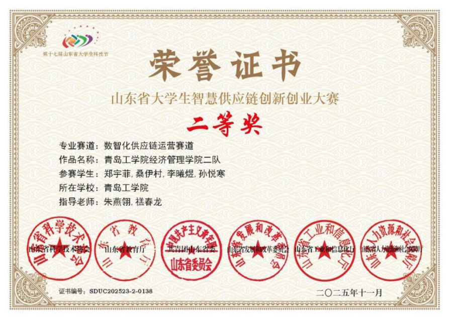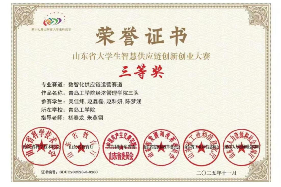 第十七届山东省大学生科技节智慧供应链创新创业大赛”于2025年11月1日落幕,我校经济管理学院禚春龙、朱燕翎老师带领“青岛工学院经济管理学院一队”(杜政煊、赵喜超、王敬文、张志远)获得“本科组一等奖”,“青岛工学院经济管理学院二队”(桑伊村、郑宇菲、孙悦寒、李曦煜)获得“本科组二等奖”,“青岛工学院经济管理学院三队”(吴佳炜,赵鑫磊,赵科妍,陈梦涵)获得“本科组三等奖”。大赛由山东省科学技术协会联合山东省教育厅、共青团山东省委、山东省发展和改革委员会、山东省工业和信息化厅、山东省人力资源和社会保障厅共同主办,山东科技咨询协会、济南工程职业技术学院承办,上海百蝶教育科技有限公司、济南华峻科技有限公司提供技术支持。