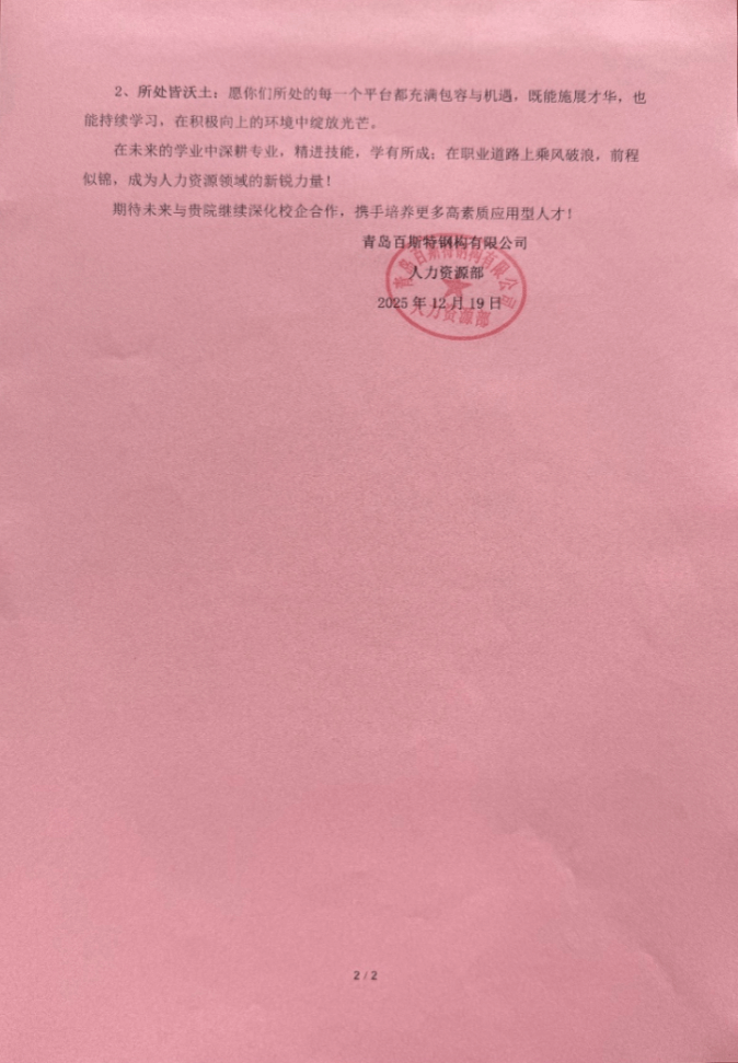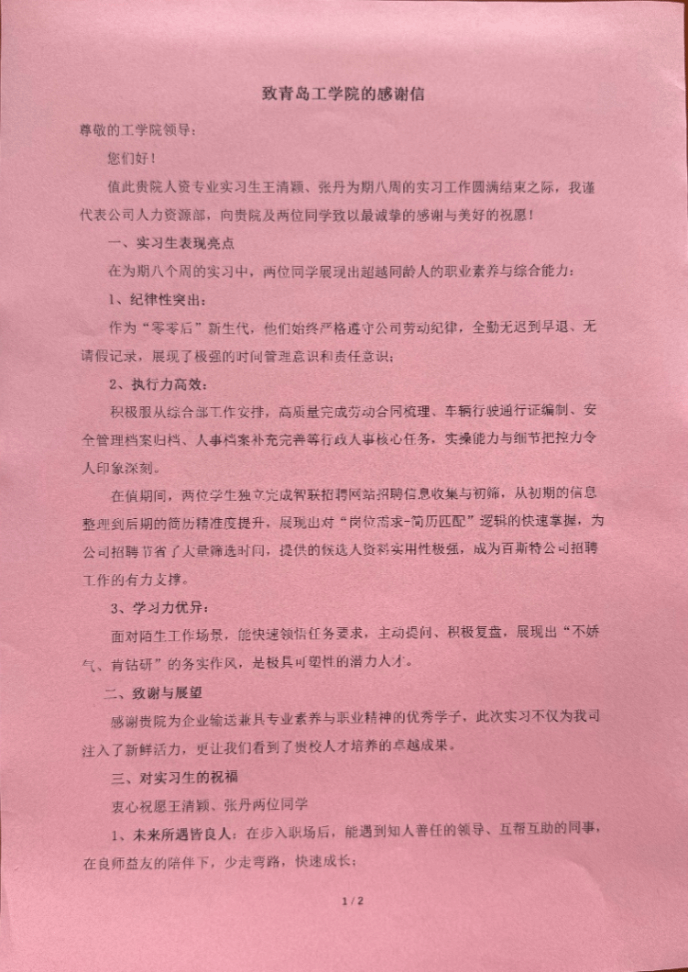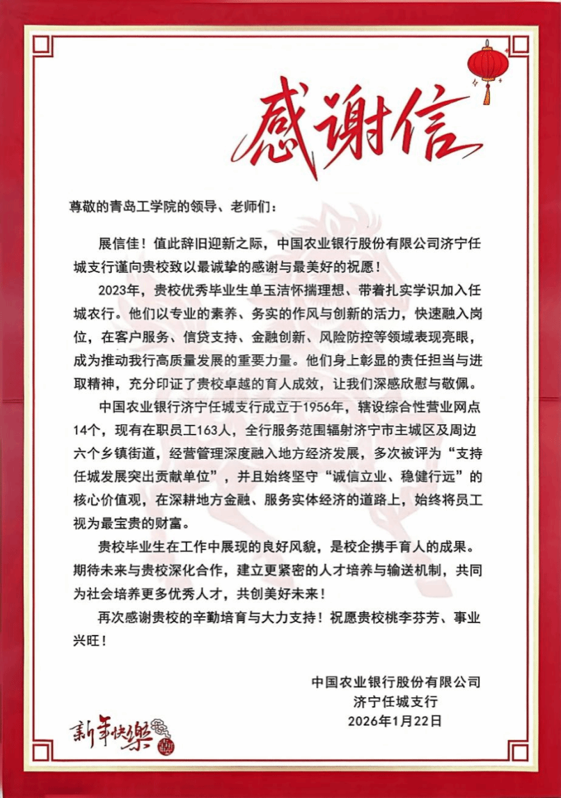 近日,青岛工学院经济管理学院接连收到来自中国农业银行股份有限公司济宁任城支行及青岛百斯特公司人力资源部的感谢信,信中对学院输送的优秀毕业生及实习生在岗期间的突出表现给予高度评价...