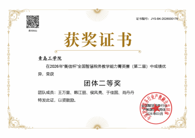 近日,第二届“衡信杯”全国智慧税务教学能力菁英赛圆满落下帷幕,我校经济管理学院教师团队放弃寒假休息时间,积极参赛,最终凭借扎实的专业功底和卓越的实战能力,荣获教师团体二等奖,王万里老师荣获个人二等奖,侯风亮、韩江丽老师分别荣获个人三等奖。
