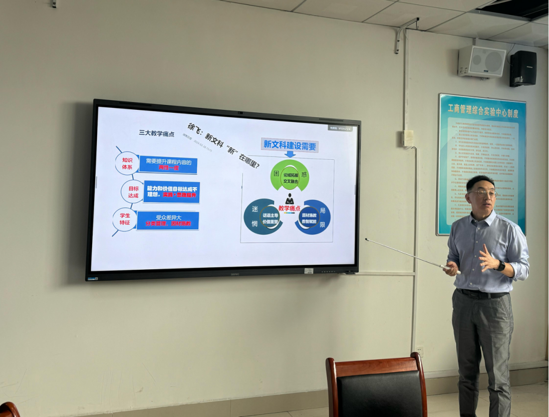 张同功围绕“教学创新大赛经验分享”,结合《金融学》课程的赛程案例,从教创赛办赛的背景、目标和要求、课程建设、备赛过程等方面,生动还原了新文科建设背景下《金融学》课程多元化创新路径的思考与实践。针对《金融学》面临的“论域拓展”之困与“交叉融合”之惑、“话语主导”之迷与“价值重塑“之惘,以及“因材施教”之局和“数智赋能”之限等现实问题,本着“知识筑基、适度创新、两性一度和提质增效”四大原则,进行“脚踏实地、仰望星空、理实双驱、多元融通”的课程创新与实践,张教授提出“论域拓展、交叉融合,话语主导、价值重塑,因材施教、数智赋能”等路径破局,实施知识、思政、实务、案例、科研“五位一体”的教学内容重构;建设数字赋能理论体系、实务与思政案例双驱、实践基地与专家课堂建设为抓手的“理实双驱”资源库;运用问题导向、案例为器、实景再现、现场教学、数智赋能、分层教学的“多元融合”教学方法;构建面向技能、注重过程、升级提阶的多维考评体系,为骨干教师们提供了可借鉴的课程建设实战指南。他特别强调老师们要转变思想认识、认真研习主题、对标标准、提升教学水平,要将教学目标量化,并在材料打磨、答辩、报告撰写等方面一一给出建议。他强调备赛过程是对教学能力的全面提升,坚持本身就是成长,希望老师们坚定自信、拥有迎难而上付诸行动的毅力。